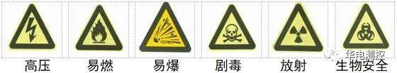 危險標識由安全色,幾何圖形和圖形符號構成,用以表達特定的危險信息,提示人們周?chē)h(huán)境中有相關(guān)危險因素存在。常見(jiàn)的危險標識包括高壓、易燃、易爆、劇毒、放射、生物安全等。