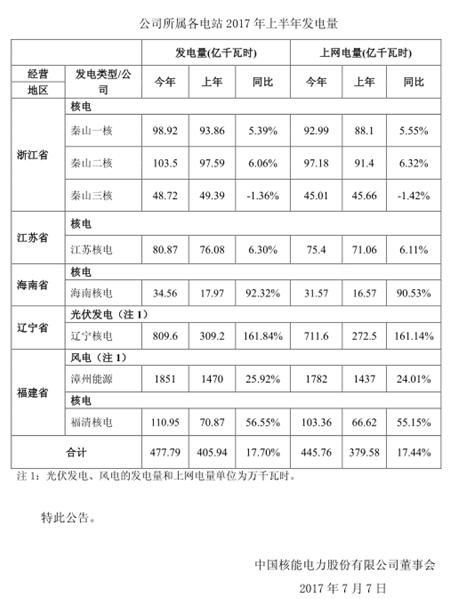 日前,中國核能電力股份有限公司(簡(jiǎn)稱(chēng)“中國核電”)公告了公司所屬電站2017年上半年發(fā)電量,上半年發(fā)電量達477.79億千瓦時(shí),同比增長(cháng)17.7%。