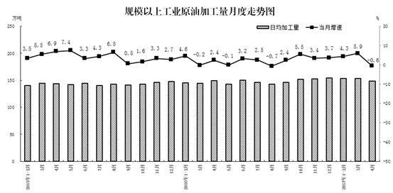 原油加工量下降。4月份,原油加工量4445.2萬(wàn)噸,同比下降0.6%;日均加工量148.2萬(wàn)噸,比3月份下降3.3%,這主要是受部分大型石化企業(yè)停產(chǎn)檢修影響。主要成品油生產(chǎn)也有所回落,其中,汽油產(chǎn)量同比下降4.0%,煤油產(chǎn)量增長(cháng)2.2%,柴油產(chǎn)量下降0.6%。1-4月份,原油加工量18251.0萬(wàn)噸,同比增長(cháng)3.1%,比1-3月份回落1.4個(gè)百分點(diǎn)。