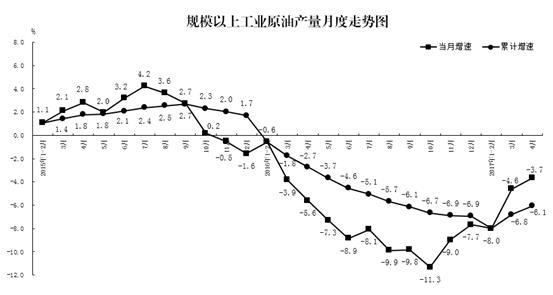 原油生產(chǎn)降幅收窄,進(jìn)口增長(cháng)較快。4月份,原油產(chǎn)量1599.0萬(wàn)噸,同比下降3.7%,降幅比3月份收窄0.9個(gè)百分點(diǎn)。1-4月份,原油產(chǎn)量6400.9萬(wàn)噸,同比下降6.1%。進(jìn)口13912萬(wàn)噸,同比增長(cháng)12.5%。