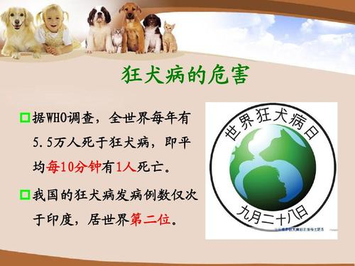 據世界衛生組織在報告披露,狂犬病遍布于全世界,每年全球有55000人死于狂犬病,即每10分鐘就有1人死亡。此外,亞洲和非洲有1000萬(wàn)人在被可能患有狂犬病的狗咬傷后,接受狂犬病疫苗注射。為了喚起全球的重視,在國際狂犬病控制聯(lián)盟的倡議下,世界衛生組織、世界動(dòng)物衛生組織及美國疾病預防控制中心等共同發(fā)起并確定,每年的9月28日為世界狂犬病日。通過(guò)設立世界狂犬病日,將集合眾多的合作者和志愿者,群策群力,盡快使狂犬病成為歷史。第一個(gè)“世界狂犬病日”活動(dòng)之后,各國紛紛開(kāi)展相應宣傳活動(dòng),相關(guān)的各項活動(dòng)獲得里程碑式的成功,將全球的狂犬病預防和控制工作向前推進(jìn)了一大步。