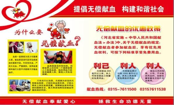 如今,無(wú)償獻血已經(jīng)成為了衡量一個(gè)社會(huì )文明程度的標志,各個(gè)國家的政府都十分重視和關(guān)心無(wú)償獻血。每年的6月14日是世界獻血者日。設立這個(gè)世界獻血者日,是為他人著(zhù)想,捐獻熱血,分享生命。世界上每秒鐘就有3個(gè)人需要輸血,血液的來(lái)源只能依賴(lài)于他人的捐獻。自愿無(wú)償獻血是唯一安全的血液來(lái)源,這是世界各國的共識。我們國內的獻血一般是無(wú)償獻血。獻血是健康適齡的公民自愿獻出血液,去挽救他人生命,而不索取任何報酬的行為。提倡無(wú)償獻血,構建和諧社會(huì )。關(guān)于無(wú)償獻血的意義: 生命離不開(kāi)血液,輸血是搶救危重病人的一種特殊醫療措施。在目前人造血液尚不能完全代替人體血液之時(shí),臨床用血只能靠健康人體捐獻。無(wú)償獻血是團結友愛(ài)、無(wú)私奉獻精神的具體表現,也是一種互救互助的方式。“獻血”最大好處就是可以救助病人,也是無(wú)償獻血者仁心義舉的表現。同時(shí)可促進(jìn)人體的新陳代謝,是一種利人利己的行為。而且,根據各地區的規定,獻血者及家庭成員還可以享受相應的用血優(yōu)待政策。這也充分體現了社會(huì )主義社會(huì )人與人之間團結互助和人道友愛(ài)的精神。無(wú)償獻血是一種無(wú)私奉獻、救死扶傷的崇高行為。獻血是一種愛(ài)心奉獻的體現,可以使傷病患者解除病痛,甚至挽救他們的生命。這種價(jià)值是無(wú)法用金錢(qián)來(lái)衡量的。獻血是救人一命的高尚品行,在助人為樂(lè )的同時(shí),也能夠使自己的精神得到凈化。如果一個(gè)人擁有健康的情緒,就可以使人體免疫力增強,抵抗力提高,使各個(gè)器官的功能處于一個(gè)良好的狀態(tài)。無(wú)償獻血是終身的榮譽(yù),獻血者也會(huì )受到社會(huì )的尊重和愛(ài)戴。這也是一項社會(huì )公益事業(yè)。我國鼓勵無(wú)償獻血的年齡是18-55周歲。